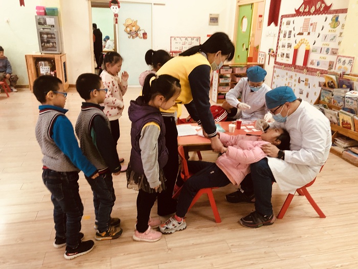 老师们与医护人员密切配合,组织孩子井然有序的进行口腔检查和牙齿涂氟。医生们认真检查孩子们的牙齿及口腔卫生状况,边操作边耐心对孩子们进行情绪上的安抚,及时消除了孩子们紧张的心理,为每个孩子的牙齿穿上一件“保护衣”。在各幼儿园老师的有序组织,医务人员的耐心工作下,顺利完成了本次的涂氟工作。