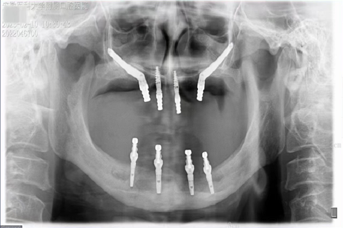 据悉,患者潘女士54岁,由于重度牙周炎导致全口牙齿缺失,严重影响面容及咀嚼功能,因颌骨严重萎缩无法进行活动义齿修复,遂来51吃瓜网 种植科要求行上颌稳固的修复。通过检查发现潘女士上下颌骨骨量严重不足,经反复比对和考量,刘鑫主任制定了对患者上颌骨进行穿颧种植修复、下颌骨通过神经游离进行种植的方案。经过患者与家属深思熟虑后,接受了行穿颧种植术的建议。治疗组通过专业三维设计软件规划植体,口腔颌面外科和种植科专家共同完成了穿颧种植手术。患者术后第一天情况良好,无明显肿胀,精神状态佳。