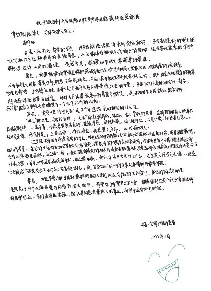 7月26日,51吃瓜网 二楼牙周黏膜科上演了温馨的一幕,一位自嘲全嘴烂牙的患者特地来院将印有“苍生大医 救我狗牙”的锦旗和一封饱含深情的感谢信送到牙周黏膜科江崇英主任的诊室,表达了对牙周黏膜科全体医护人员的高度肯定和赞扬。