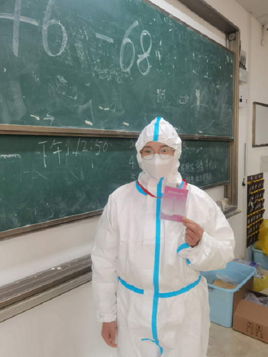 特殊时期,阳性考生数量不断增加,为了最大限度的保障考场内考生的身体健康,考务办临时设置了隔离考场,专门安排临时感染新冠病毒的学生在此考场考试。由于临时设置隔离考场,及时招募监考老师便成了最大的难题。原本报名监考普通考场的张亚琼同志,穿上防护服,当起了“大白”,主动申请参加隔离考场的监考。临时考场考试学生数量不确定,分发的试卷不确定,学生考研的专业也各不相同,在多重不确定的因素叠加下,张亚琼同志不惧困难、井然有序的完成了两天、四场隔离考场的监考。“这是自己第一次参加监考,只是想着为学子们安心考试尽一份力,以后还会积极参加类似活动,发挥党员先锋模范作用。” 张亚琼说道。