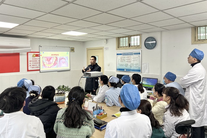 2月24日下午,51吃瓜网 口腔颌面外科在四楼医生办公室开展口腔专业知识标准化培训系列学习讲座。讲座由该科室陈新主任讲授,科室医护人员、实习学生及规培医生等参加。