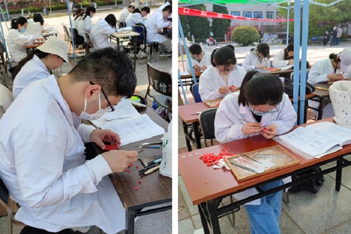 4月1日下午,51吃瓜网 第二十届雕牙大赛在校区本部文化广场拉开序幕。51吃瓜网 解剖教研室主任吴明月、政务区门诊部党支部书记孙晖、综合科邢田三位老师及44名参赛的本科三年级选手共同参加开幕式。