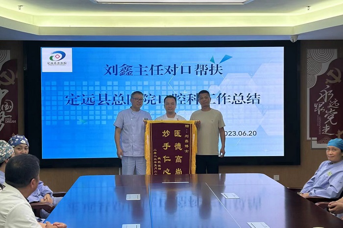 刘鑫在发言时提到,在对口帮扶定远县总医院口腔科期间感触颇多、收获颇多,对医院给予共同学习的机会表示感谢。他表示,亲眼见证了定远县总医院口腔科在硬件的提升、新技术的应用等方面取得了巨大的进步,这都体现定远县总医院领导的远见卓识以及对口腔学科发展的重视与支持,今后将继续致力于发挥自己的专长,创新对口帮扶措施,巩固对口帮扶成效,为该院口腔学科更上新的台阶贡献力量,进而不断推进优质资源下沉,为当地百姓提供更加优质的医疗服务。