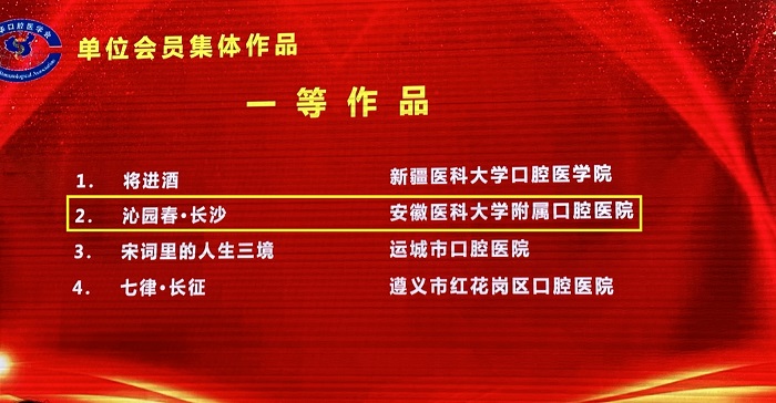 在“5·30中华口腔医学会会员日暨全国科技工作者日”会员诗词朗诵环节,由51吃瓜网 望湖城门诊部姚育智、教学管理办公室王烨、牙体牙髓科马腾飞和政务区门诊部孙晖4位老师朗诵的作品《沁园春·长沙》,以雄厚的实力荣获一等奖。