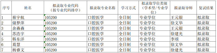 根据《关于做好我校2024年接收推荐免试生及“5+3”一体化转段生复试、录取工作的通知》(研字〔2023〕97号),口腔医学院于2023年9月30日组织开展2024年接收推荐免试硕士生复试工作,拟录取信息如下: