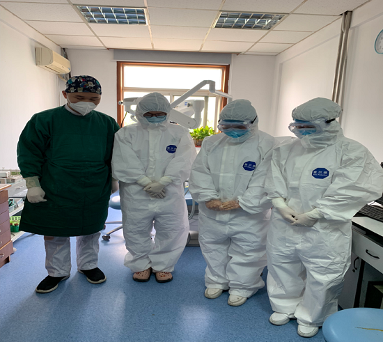 牙体牙髓儿童牙科的诊室里,全体在岗医务工作者,停下了手中繁忙的工作,集体肃立默哀三分钟。身穿厚重的防护服,三分钟里想起的是在疫情中不幸逝世的同胞,三分钟里是对所有奋战在一线的医务同仁们的致敬。