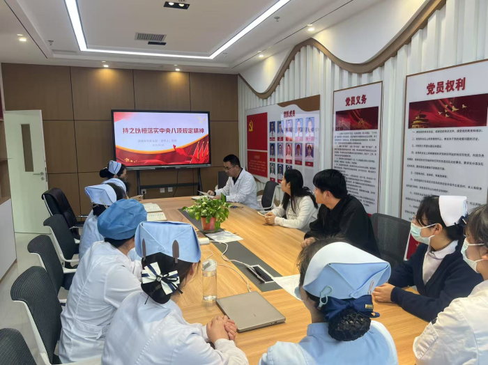 近日,口腔颌面外科党支部在二病区党员活动室召开专题党课学习会,党支部书记陈新以“持之以恒落实中央八项规定精神”为题,为全体党员授课,深化党纪学习教育,强化全面从严治党政治责任。