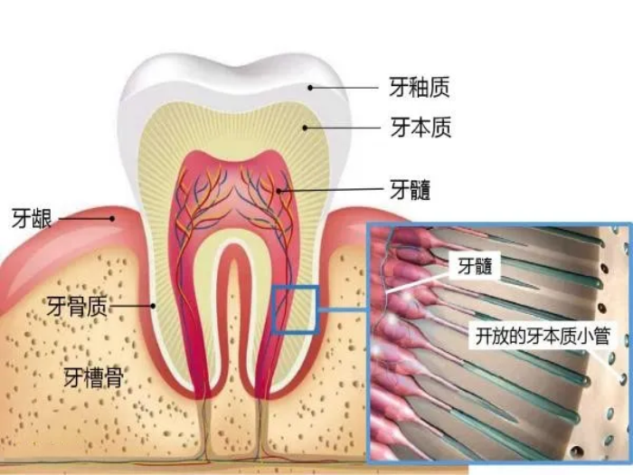 牙齿从外部形态上可分为牙冠、牙颈、牙根,按组织学又可分为牙釉质、牙本质和牙髓三部分。牙釉质是人体最坚硬的组织,覆盖于牙齿表面,呈半透明状,能够保护牙齿内部的牙本质和牙髓组织。牙本质是构成牙体的硬组织,主要由牙本质小管与间质组成。牙本质小管里面充斥着液体,正常情况下,这些液体会缓慢流动,但当牙釉质遭到破坏,牙本质暴露,外界温度、机械或化学因素刺激作用于牙本质小管表面,导致牙本质小管中的液体受到刺激产生双向流动,引起神经末梢疼痛。