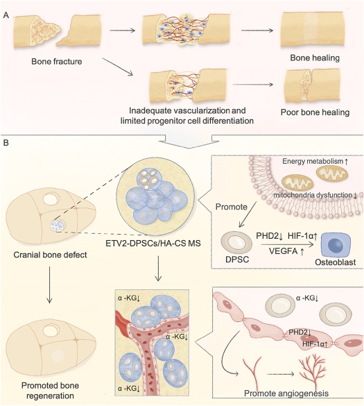 该研究揭示了ETV2在调节细胞内HIF-1α稳态,影响成骨细胞成骨分化,重塑骨缺损区微环境,加速血管化骨再生作用。课题组首先发现在MSC的成骨谱系分化过程中伴随着ETV2的高表达;在人牙髓干细胞中,ETV2的瞬时激活能够维持细胞内HIF-1α稳态,并通过PHD2–HIF–1α-VEGFA轴促进成骨分化。此外,ETV2介导的DPSCs释放的α-KG减少,创造了一个缺氧信号稳态的血管生成生态位,促进内皮细胞迁移和血管结构的快速形成。