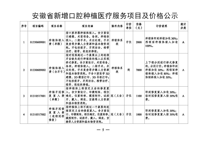 安徽省新增口腔种植医疗服务项目及价格