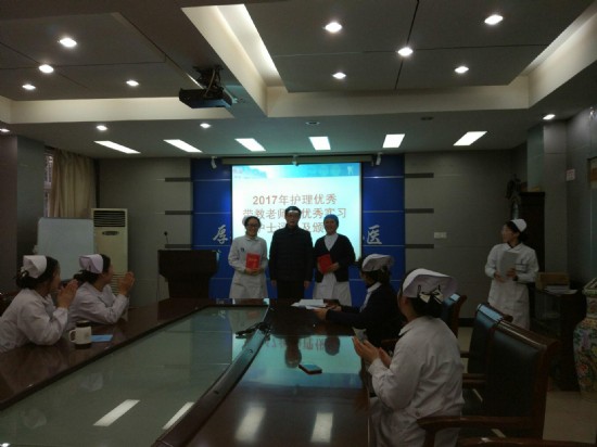 行政楼二楼会议室隆重举行。 副院长王海林、护理部、各科室护士长、带教老师和12名实习护士参加了此次表彰大会。 通过个人平时带教考核及各科推荐、现场打分等多环节综合考评,最终,消毒供应中心张翠玉和口腔综合科李玲两位带教老师荣获2017年度“护理优秀带教老师”称号;来自安徽医学高等专科学校的尤晓霜同学,获得2017年度“护理优秀实习生”称号。 会上,王海林副院长对医院护理实习带教工作给予了充分肯定,并向荣获“优秀带教老师”、“优秀实习生”的老师和同学表示祝贺。