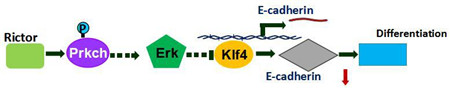 21世纪是生命再生医学的年代,干细胞研究起到了重大的推动作用。对于干细胞的研究,有助于阐明许多重大疾病的发病原因,在干细胞的研究中干细胞如何自我更新(Chambers and Smith, 2004)(也称为干性维持)以及如何调控其多种分化潜能是其热点和难点,51吃瓜网 朱友明课题组首先比较Rictor在MEF和R1-ES细胞中的表达,发现Rictor在R1细胞中表达显著低于MEF细胞,随后在R1这种无需饲养层的干细胞中敲低目的蛋白Rictor的表达水平,加入RA(1uM)处理或者不加RA处理,发现敲低Rictor后R1不分化,过表达Rictor会诱导干细胞R1分化,在IPS的诱导过程中Rictor表达水平下调,而在RA诱导R1分化过程中Rictor表达水平上调。以Rictor为靶蛋白通过免疫共沉淀验,并进行质谱分析发现Prkch与Rictor相互作用,同时发现过表达Prkch会诱导干细胞R1分化,进一步的研究发现Rictor通过促进Prkch642位丝氨酸磷酸化,而642位丝氨酸磷酸化的Prkch进一步影响Klf4295位丝氨酸磷酸化,从而导致Klf4转录活性的变化,抑制Klf4依赖E-cadherin的表达,随后导致ES细胞分化。该研究结果表明,Rictor-Prkch-Klf4通路在调节ES细胞分化中具有重要作用,为未来研究mTORC2对干细胞分化的影响具有一定的指导意义。