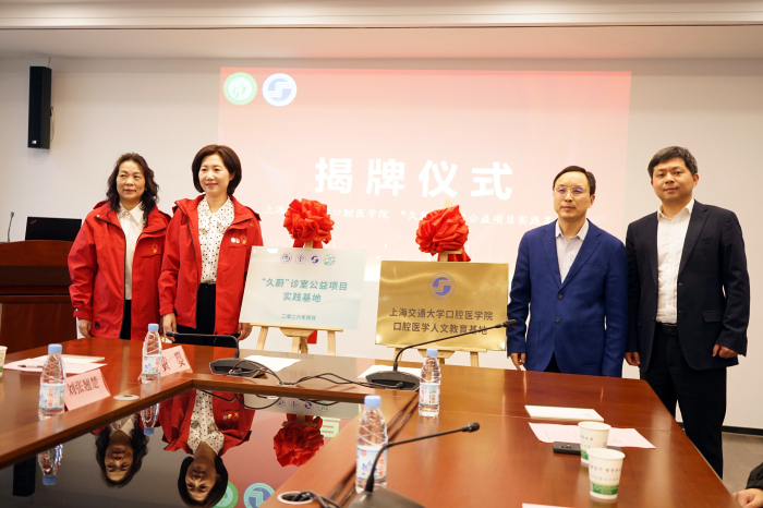随后,双方领导共同为上海交通大学口腔医学院 “久蔚” 诊室公益项目实践基地和口腔医学人文教育基地揭牌。仪式现场还举行了赠书仪式与学生党支部共建签约,双方党支部围绕党建引领、人才培养、公益服务等方面开展深入交流,为后续长效合作奠定坚实基础。