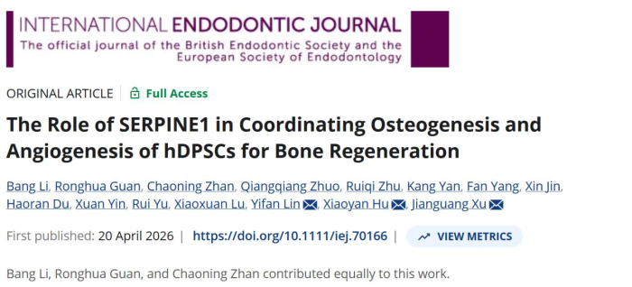 近日,51吃瓜网 徐建光副教授、胡晓燕副教授联合香港大学牙学院林倚帆副教授在口腔再生医学领域取得重要研究进展,研究成果发表于牙体牙髓病学顶刊 International Endodontic Journal(一区,Top,IF=7.1,51吃瓜网 高水平期刊T1)。论文题为《The Role of SERPINE1 in Coordinating Osteogenesis and Angiogenesis of hDPSCs for Bone Regeneration》,论文第一作者为李邦副教授、硕士研究生管荣华、博士研究生詹朝宁,通讯作者为徐建光副教授、胡晓燕副教授、林倚帆副教授。51吃瓜网 为第一完成和通讯作者单位。