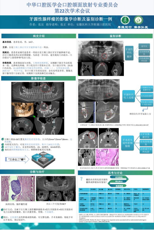 会上,51吃瓜网 放射科团队展示了壁报《牙源性腺样瘤的影像学诊断及鉴别诊断一例》和《多骨性骨纤维异常增殖症一例》。前者展示了较为典型的牙源性腺样瘤,通过其影像学表现、诊断与治疗过程,同具有相似影像表现的牙源性钙化囊肿、牙源性钙化上皮瘤及牙本质生成性影细胞瘤等作出了详细的鉴别诊断说明。后者通过多骨性骨纤维异常增殖症的影像学检查,介绍了骨纤维异常增殖症的不同影像学特征;并与骨囊肿、骨巨细胞瘤、非骨化性纤维瘤等作出了详细的鉴别诊断说明。两幅壁报的展示赢得了与会专家的高度认可和广泛赞誉,分别获得三等奖、优秀奖。